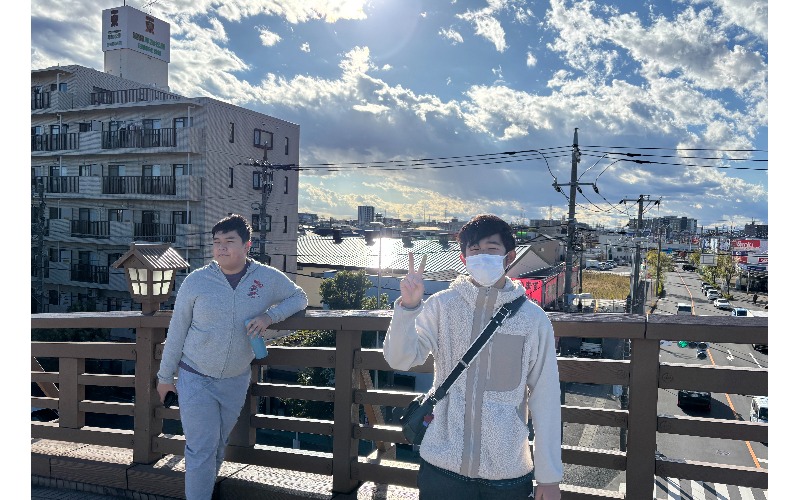 草加松原の百代橋の上で友達の写真を撮りました。
