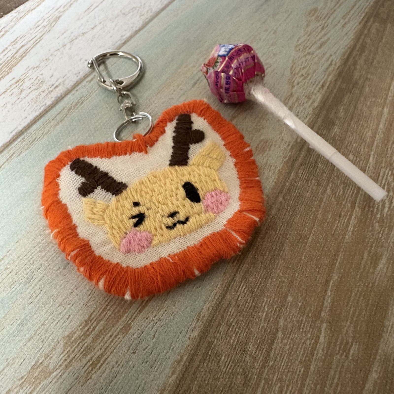 カバンなどに付けられるサイズ感の刺繍柄キーホルダーを作りました ウィンクしていて可愛いと思います☺☆
