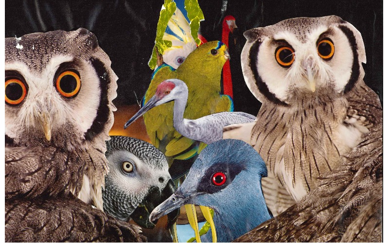 1年生課題コラージュ作品「普段、飛び回る鳥でも、睨まれれば、人は動けなくなります。」